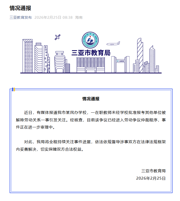三亚一在职教师未经学校批准报考其他单位被解除劳动关系 官方通报